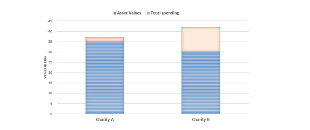 Charity A never sold any capital, so it has more left than Charity B, but it never achieved very much. Charity B made more and then spent more. Since what makes us charitable is what we spend, it is Charity A, with its bigger pile of money, that will be the failure unless it does something useful with it. Reserves are there for a purpose. Use them.